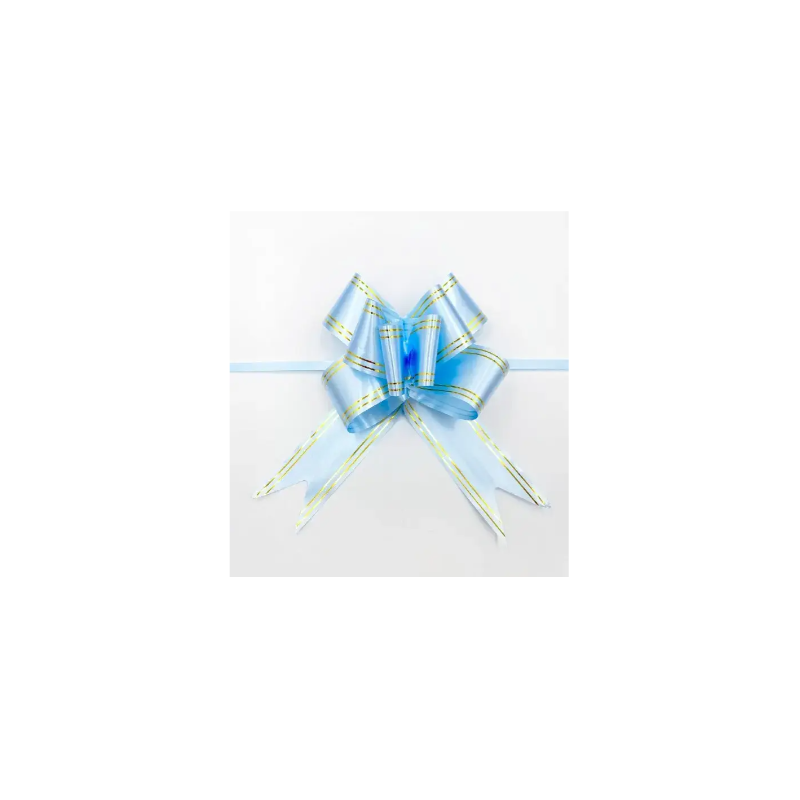 Бант стягуючий для подарунків блакитний – стильний аксесуар для святкової упаковки, який надає подарунку завершеного вигляду. Завдяки простому механізму стягування, бант легко формує об’ємну пишну прикрасу, що виглядає ефектно без зайвих зусиль.