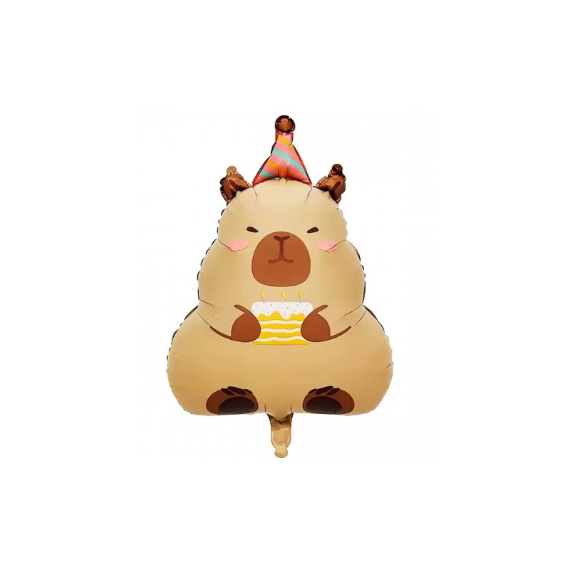 Кулька виконана у вигляді популярної капібари з тортом у міні-форматі, що виглядає дуже кумедно та сучасно. Завдяки невеликому розміру її зручно використовувати як доповнення до букетів із кульок або як елемент декору подарункових наборів.