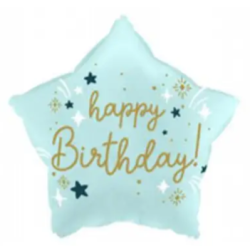 Воздушный шарик фольгирован в форме звезды Happy Birthday голубого цвета — стильный и универсальный декор для празднования дня рождения. Нежный голубой оттенок в сочетании с праздничной надписью создает легкую, яркую и торжественную атмосферу для детской или взрослой вечеринки.
