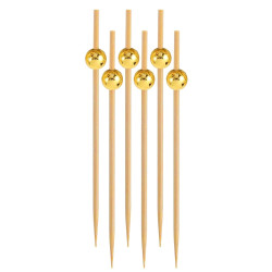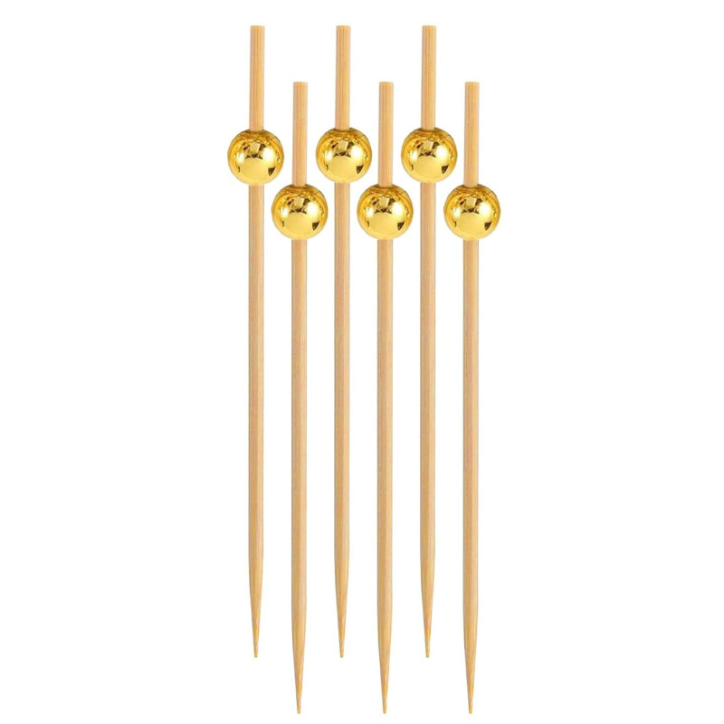 Пика Бусинка золотая 20шт/уп дерево – изысканный аксессуар для сервировки стола на любом празднике. Деревянные шпажки с декоративной золотой бусинкой выглядят стильно и придают праздничности даже самым простым закускам.