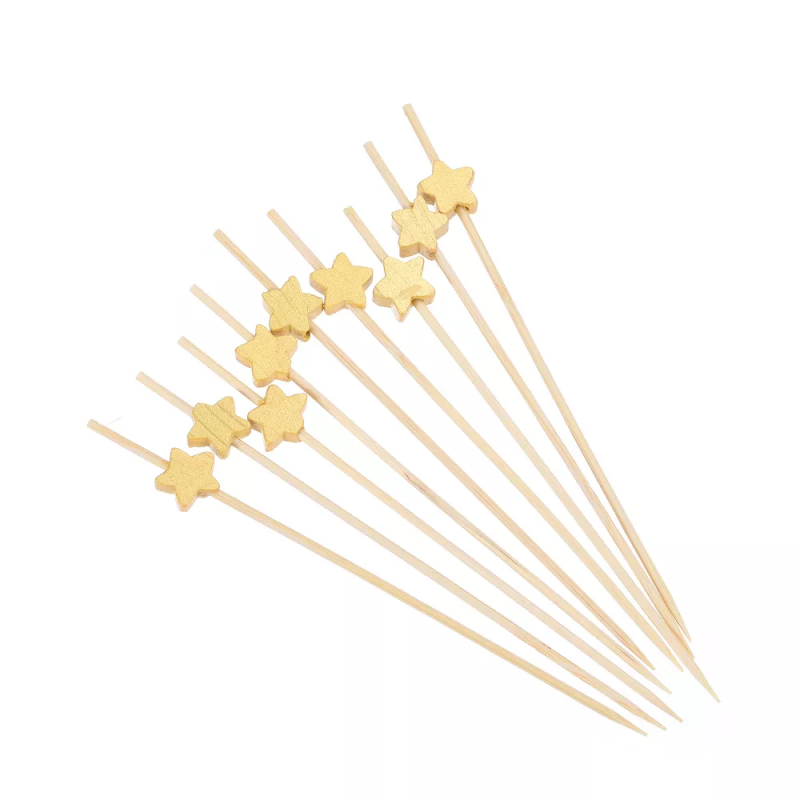 Піка Зірочка золота 20шт/уп – яскравий і святковий елемент сервірування, що зробить ваш стіл по-справжньому особливим. Дерев’яні шпажки прикрашені золотими зірочками, які додають блиску та створюють святковий настрій.